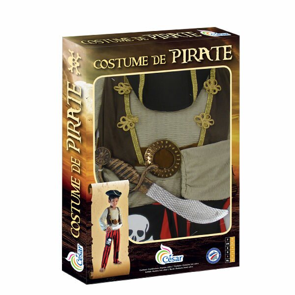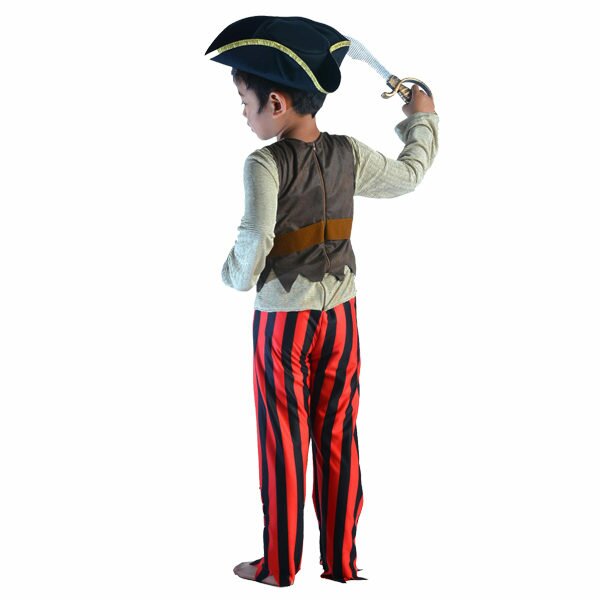 Partez à la conquête des mers avec cette combinaison trompe l’œil de pirate pour enfant composée d’une chemise, d’un gilet déchiré, d’une ceinture faux cuir, d’un pantalon rayé, d’un chapeau tricorne et d’un sabre.