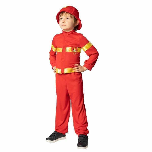 Déguisement complet de pompier avec casque épais et son blason, veste à bandes fluos et écusson, pantalon assorti.